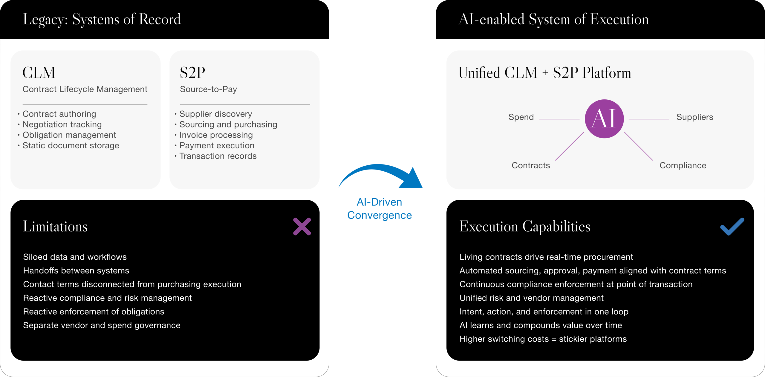 AI will transform what was an integration story between two systems of record into a platform and category-evolution opportunity — catalyzing a true convergence of CLM and S2P into a unified system of execution for managing supplier risk, spend, and compliance. This shift is reshaping the way CLM and S2P software developers build, how buyers evaluate platforms, and how investors look at strategic value in this evolving space.